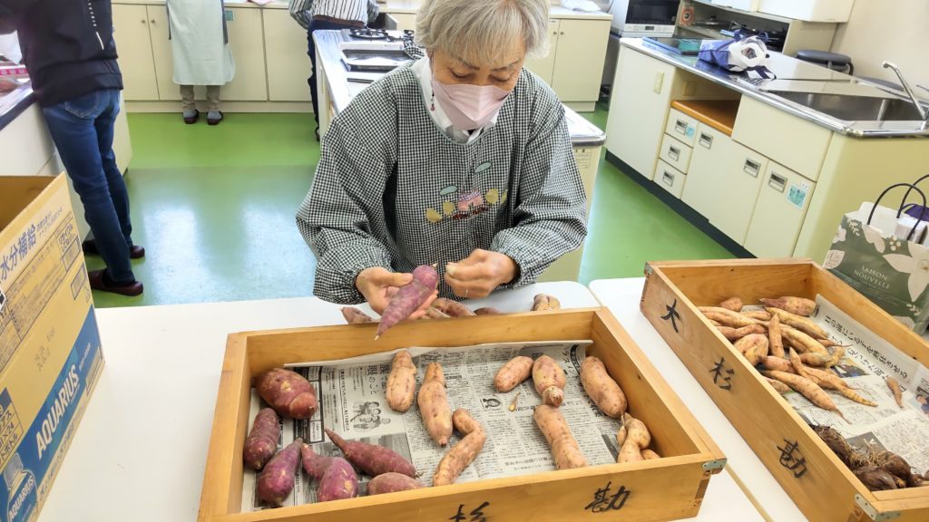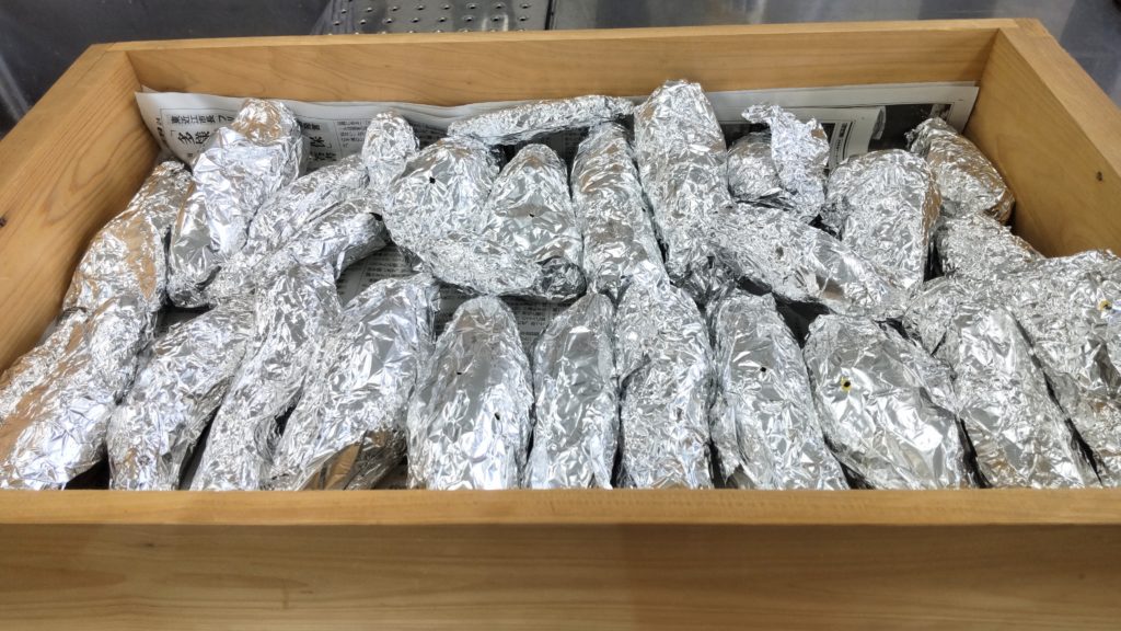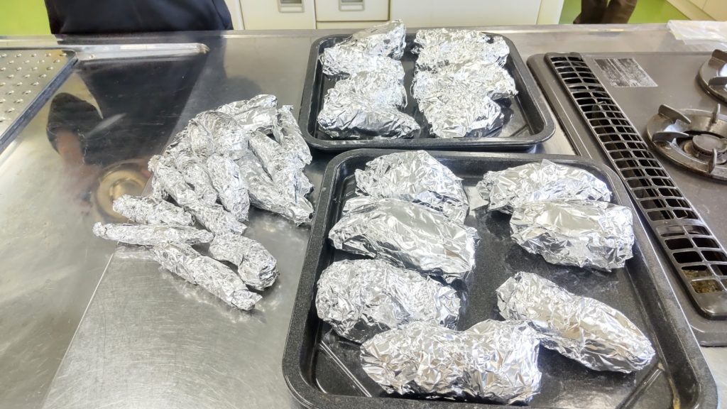 今日は明日開催される小津クラブ「親子いも掘り体験」の前日準備で、いも掘りのあとに食べていただく焼き芋の下準備をしました。