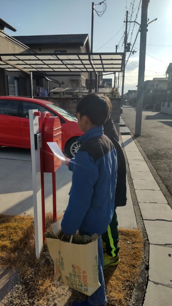 朝一番に子ども達が町内のお家を訪問し、古いお札や正月飾りの回収とお志を集めてまわります。私も少し同行させてもらいました。上手に言えるかな?とドキドキしながら、保護者の方と見守りました。