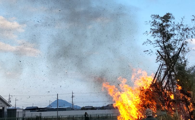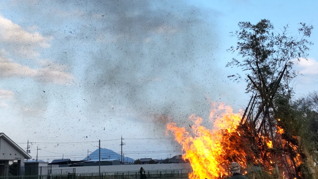 左義長祭は平安時代から伝わっている宮中行事で、地域によってはどんど焼きとも言うそうです。古い年の終わりと新しい年の始まりを象徴する火まつりで、古いお札や正月飾りを竹で組んだやしろの中に入れて炊き上げます。